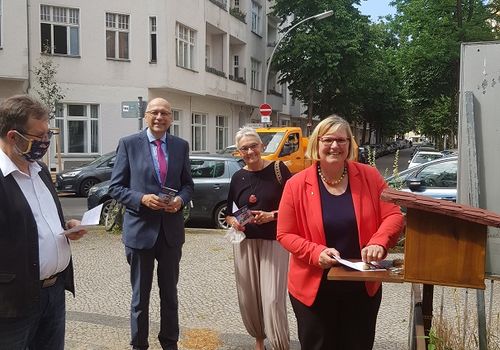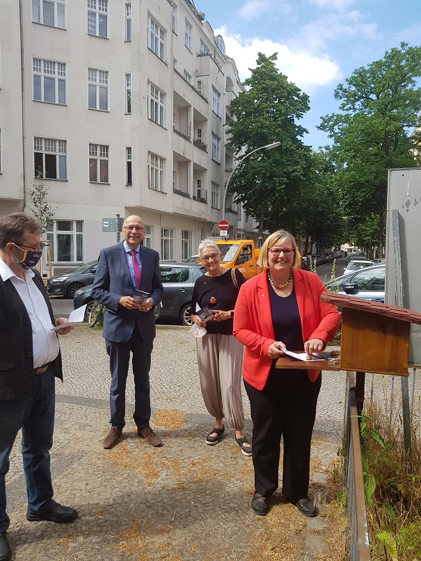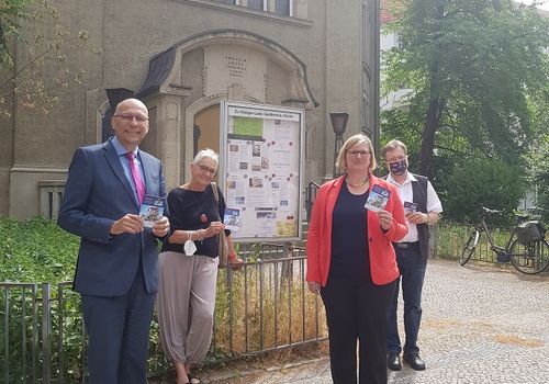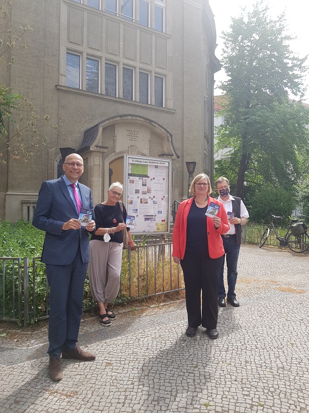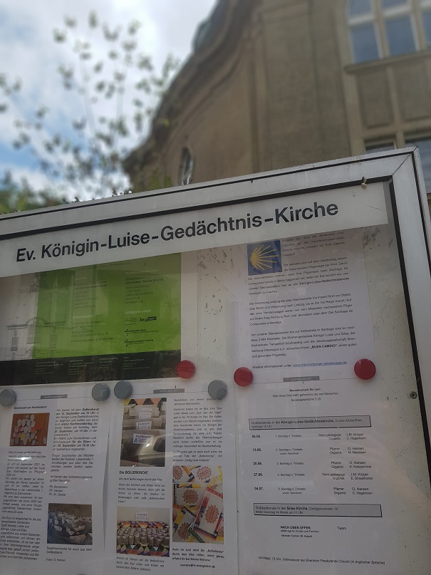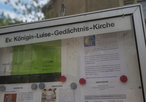 Anschließend fand ein Treffen mit Superintendent Michael Raddatz und Pfarrer Hansen an der Jakobsweg-Stempelstation an der Königin-Luise-Gedächtniskirche statt. Dort wurden neue Informationsschilder angebracht.