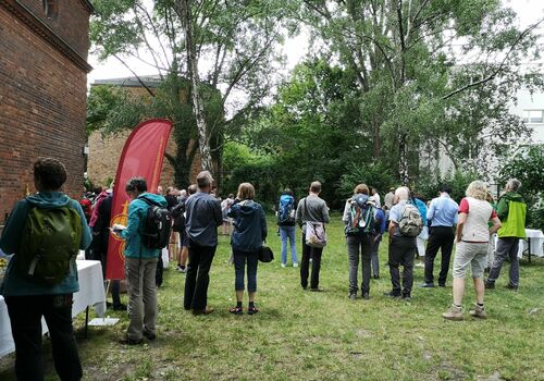 Im Anschluss gab es Unmengen an Informationen im Kirchgarten von vielen Organisationen, die sich dem Pilgern verschrieben haben, darunter unsere Schwestergesellschaft St. Jakobus-Gesellschaft Berlin-Brandenburg, der Förderverein Wunderblutkirche Bad Wilsnack mit dem zugehörigen Projekt "biopilgern", die Frauenselbsthilfegruppe Krebs mit "Pilgern gegen Krebs", der Kirchenkreis Spandau mit den "Spandauer Pilgerwegen", die Ökumenische Pilgerinitiative Stralsund und, und, und.