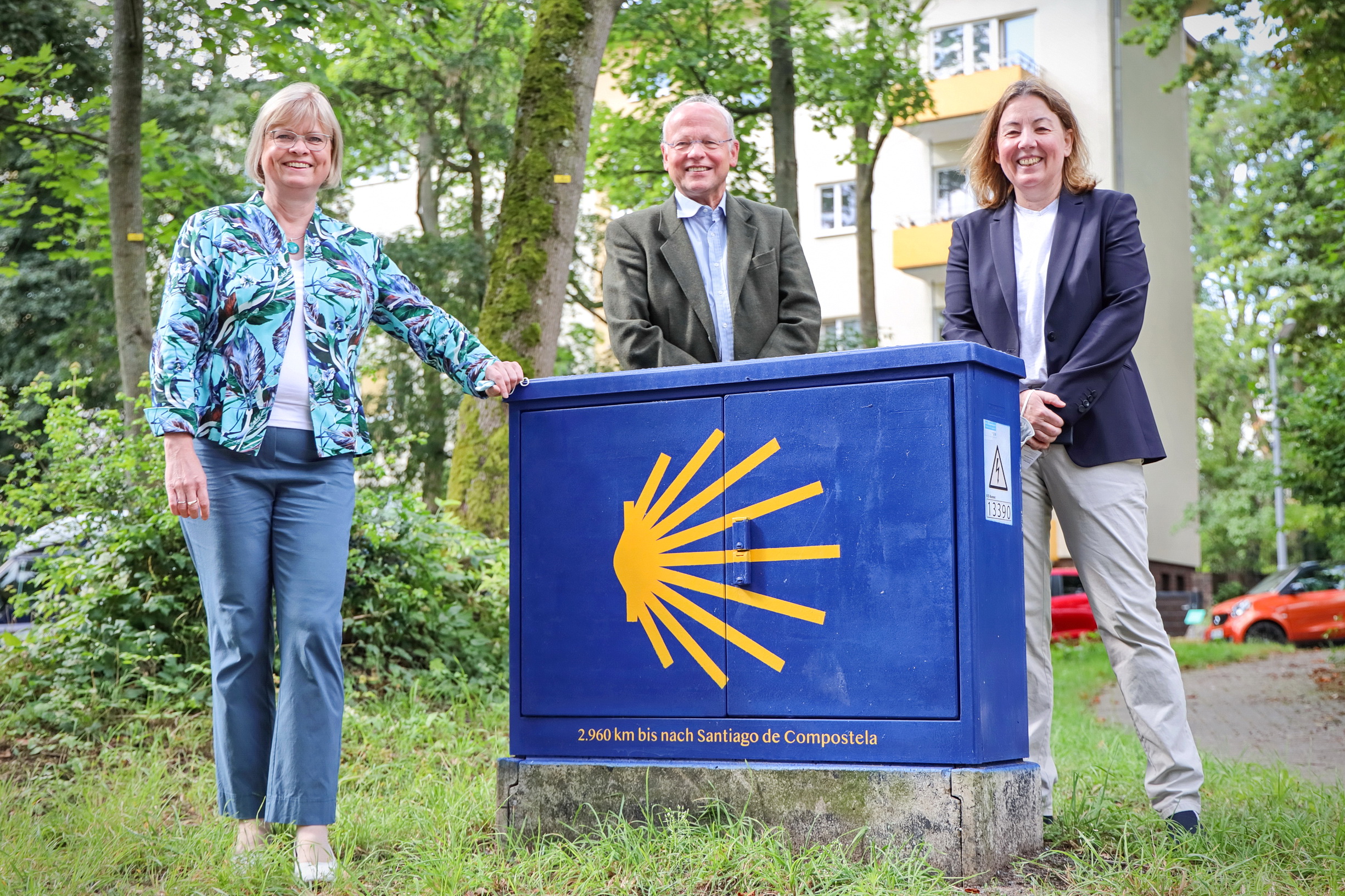 Am 2. August wurden in Steglitz-Zehlendorf neun weitere Jakobsweg-Stromkästen eingeweiht. Zusammen mit Bezirksbürgerbürgermeisterin Cerstin Richter-Kotowski und Dr. Christopher Frantzen, Präsident der Jakobusgesellschaft Brandenburg-Oderregion, hatte die Stromnetz Berlin GmbH, vertreten durch Kerstin Riesch, Leiterin Mittel- und Niederspannungsnetz, zu einem Fototermin eingeladen.
